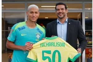 理查利森晒出与纪念球衣的合照,配文:“为国家队出战50场比赛!谁能想到那个来自新维尼西亚的孩子会穿上这件球衣,并达到这一里程碑?”