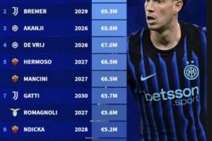 意甲中卫税前年薪排行:巴斯托尼1020万欧元居首,前四国米三席