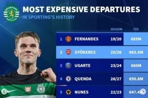 体育资讯7月27日讯 阿森纳已经官宣签下瑞典中锋约克雷斯,《转会市场》也统计了葡体历史最贵卖人情况。