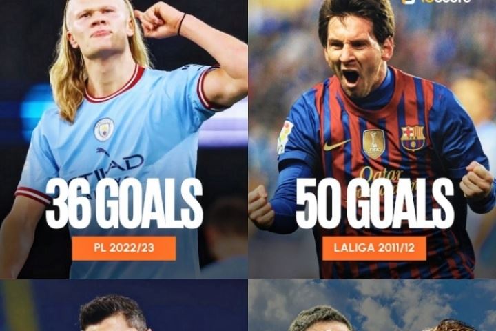 体育资讯07月28日讯 外媒IGScore统计了欧洲四大联赛英超、西甲、德甲、意甲历史单赛季进球最多的球员,分别是哈兰德、梅西、莱万、伊瓜因&因莫比莱。